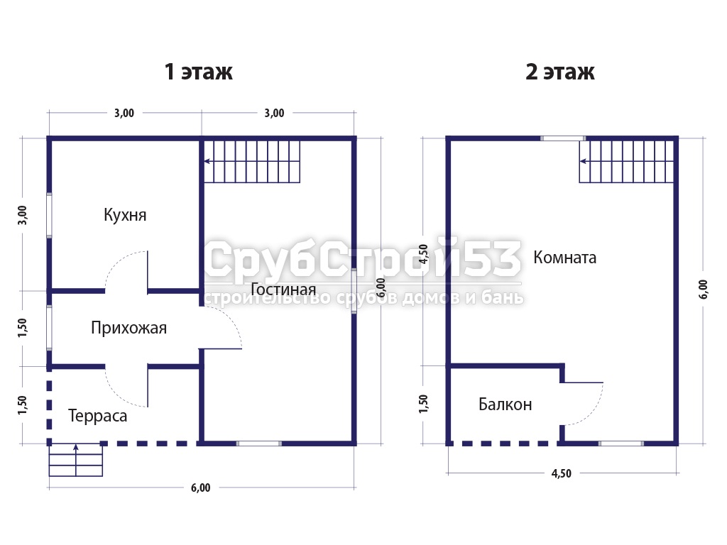 С перилами, с точёными балясинами и стартовыми столбами. Одномаршевая и двухмаршевая (по проекту)