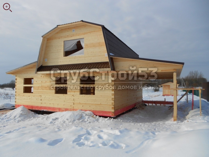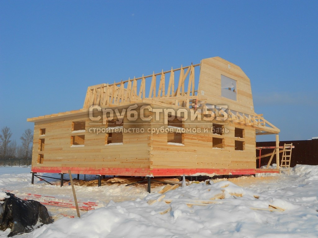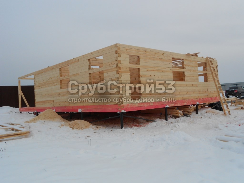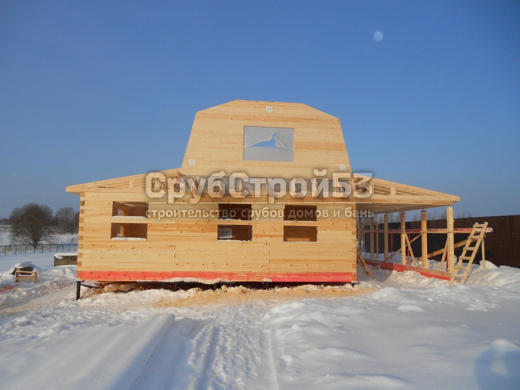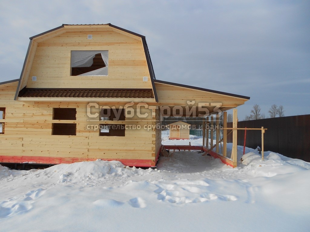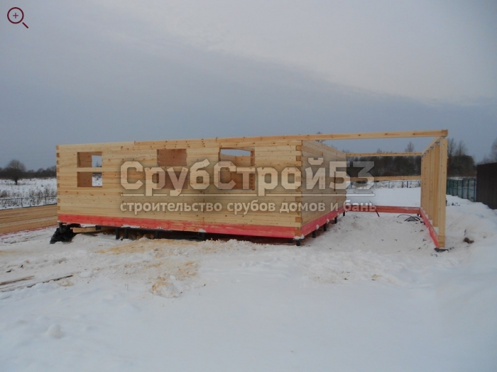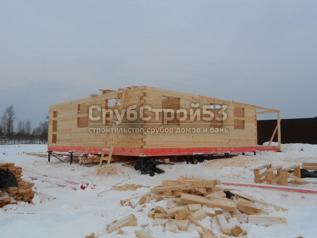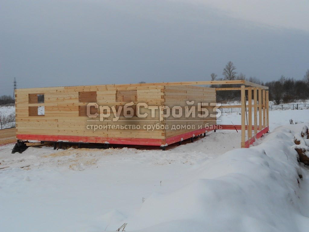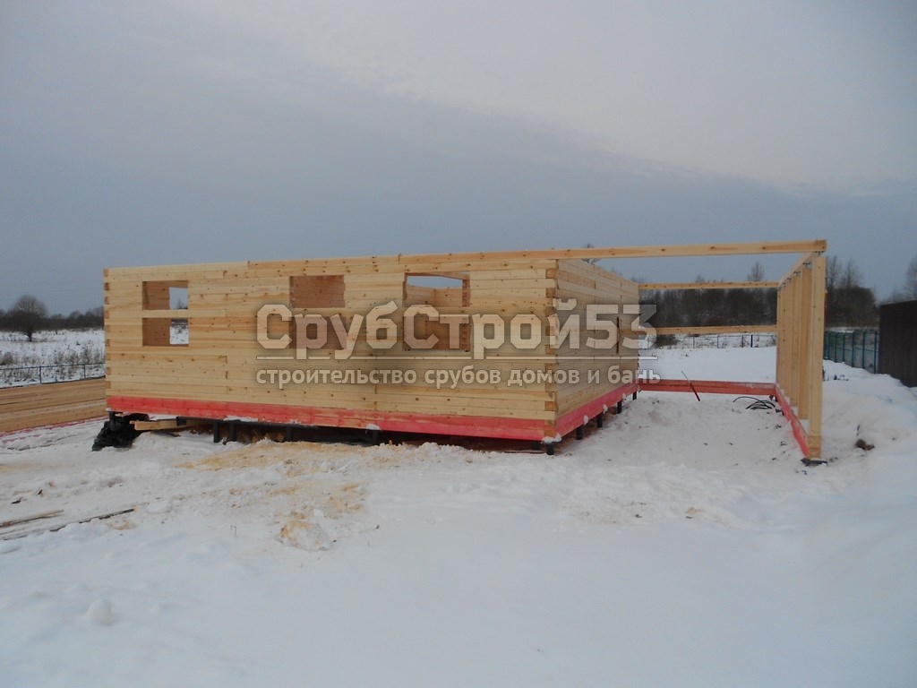 Сруб дома общими размерами 12,5х9,0 (9,0х9,0 из профилированного бруса 150х150 и открытый навес 3,50х9,0) построен в Новгородской обл., г.Сольцы