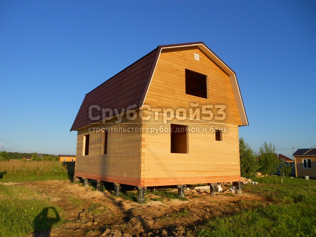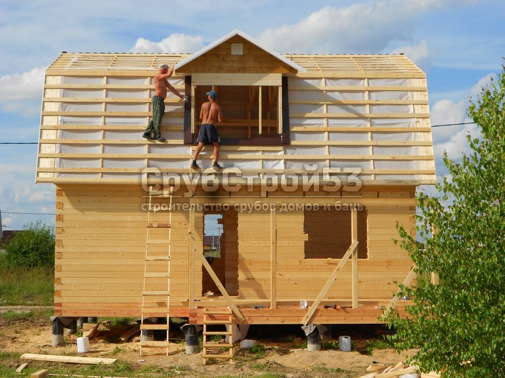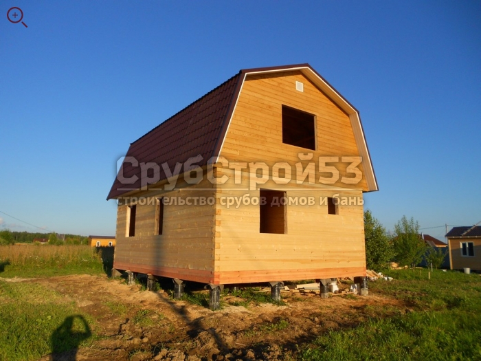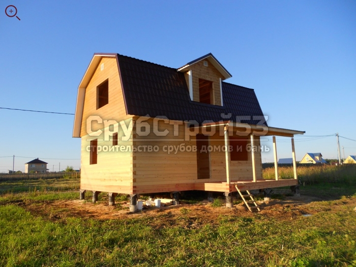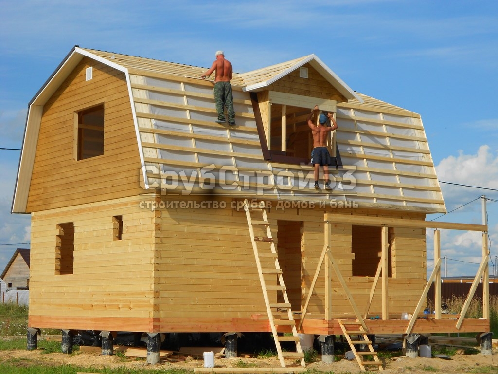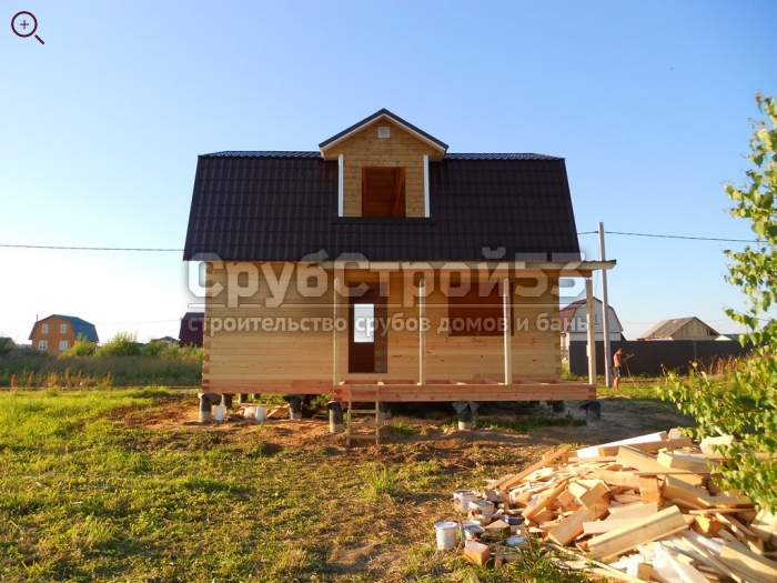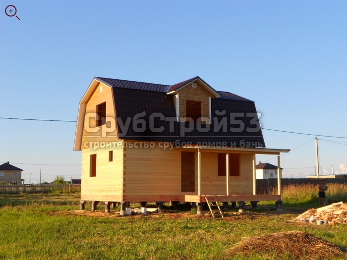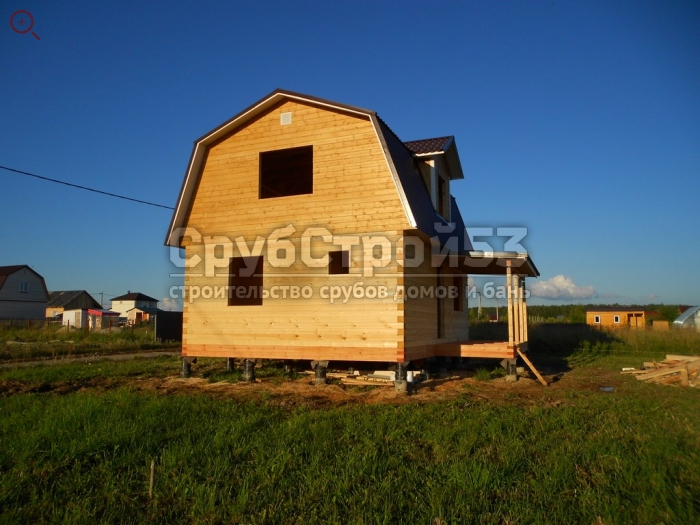 Сруб дома 6,0х8,0 из профилированного бруса 150х150 под ломаной крышей с кукушкой 2,0х1,0 и открытой террасой 2,0х5,0 построен в Московской обл., Чеховский р-н, д. Филипповское