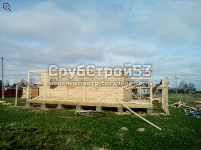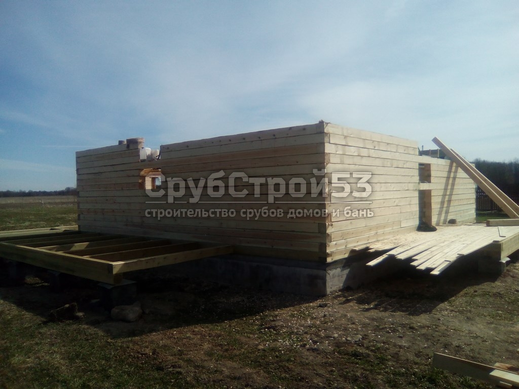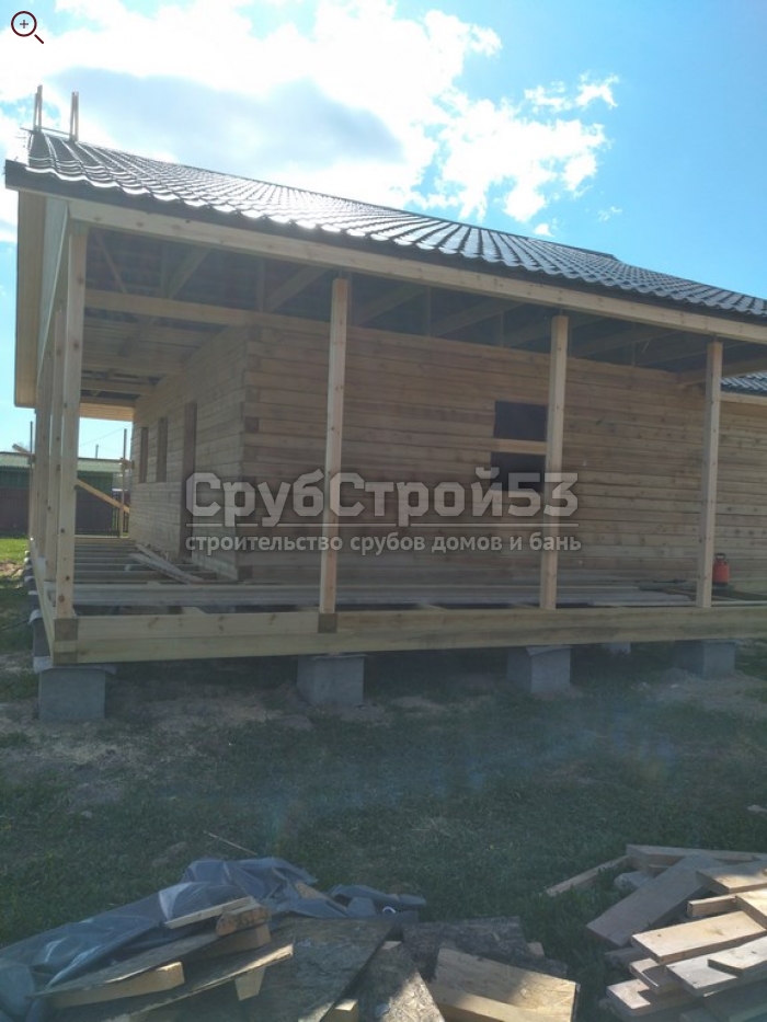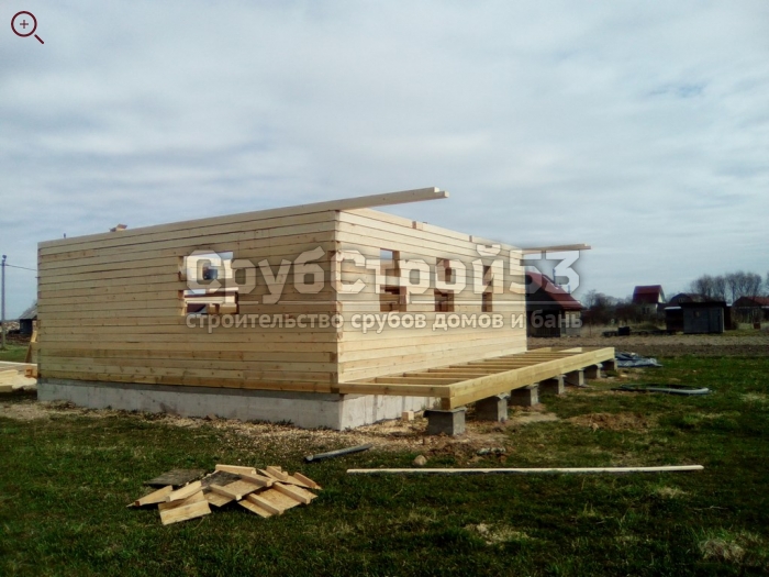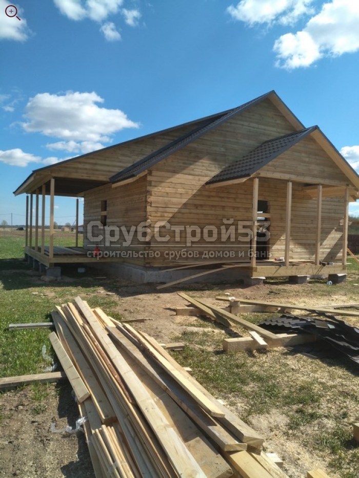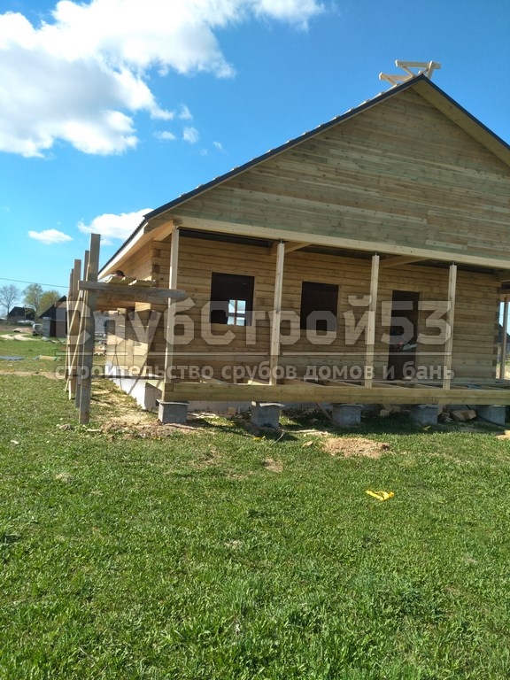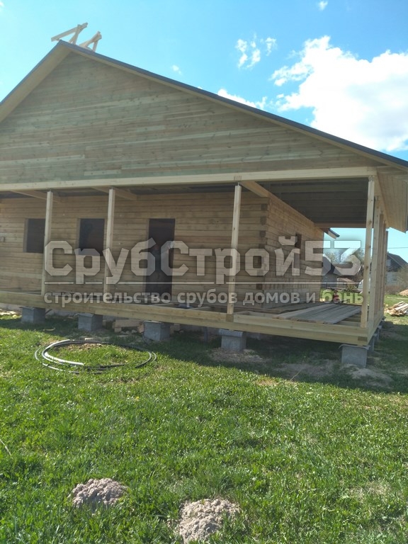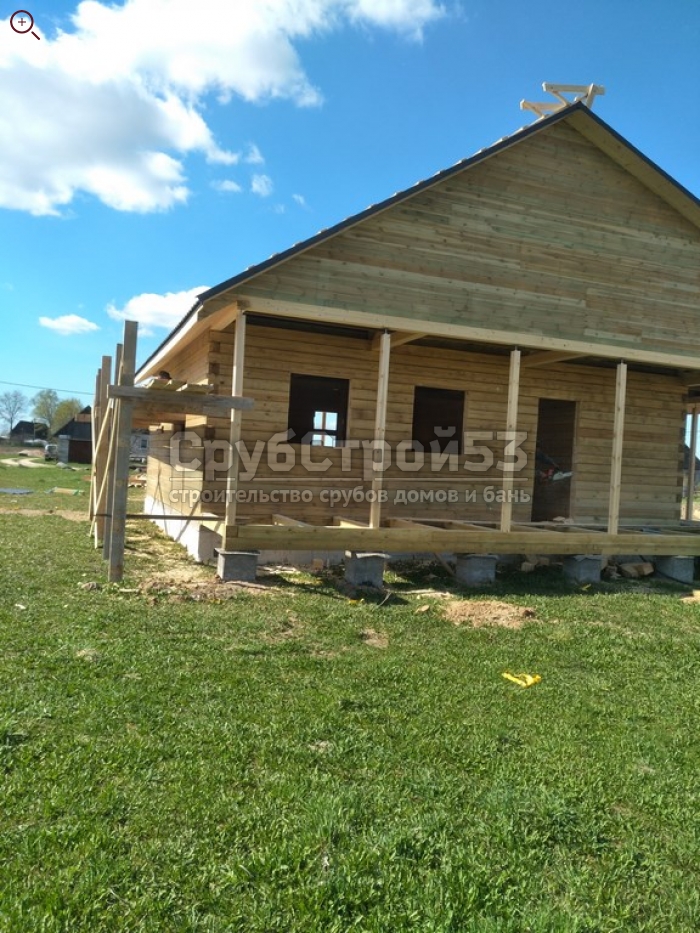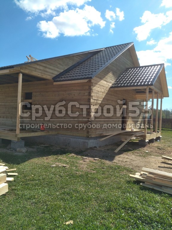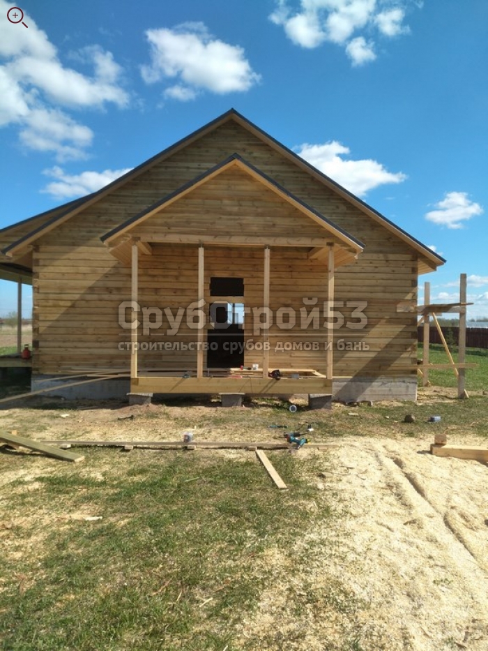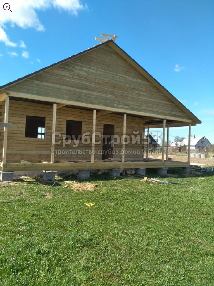 Одноэтажный сруб дома 8,0х9,0 из обрезного бруса 150х150 и терраса буквой Г 1,5х11,5 и 2,5х7,5 под общей двухскатной крышей и крыльцо 2,0х4,0 под отдельной крышей построен в Ленинградской обл., Волосовский р-н, п. Калитино.