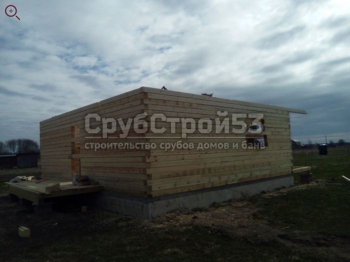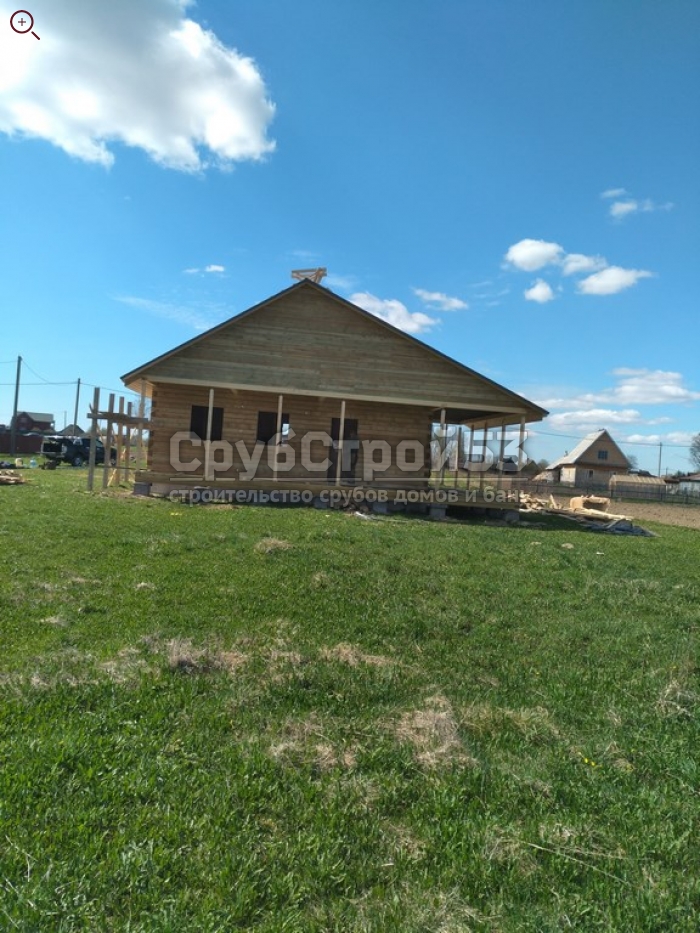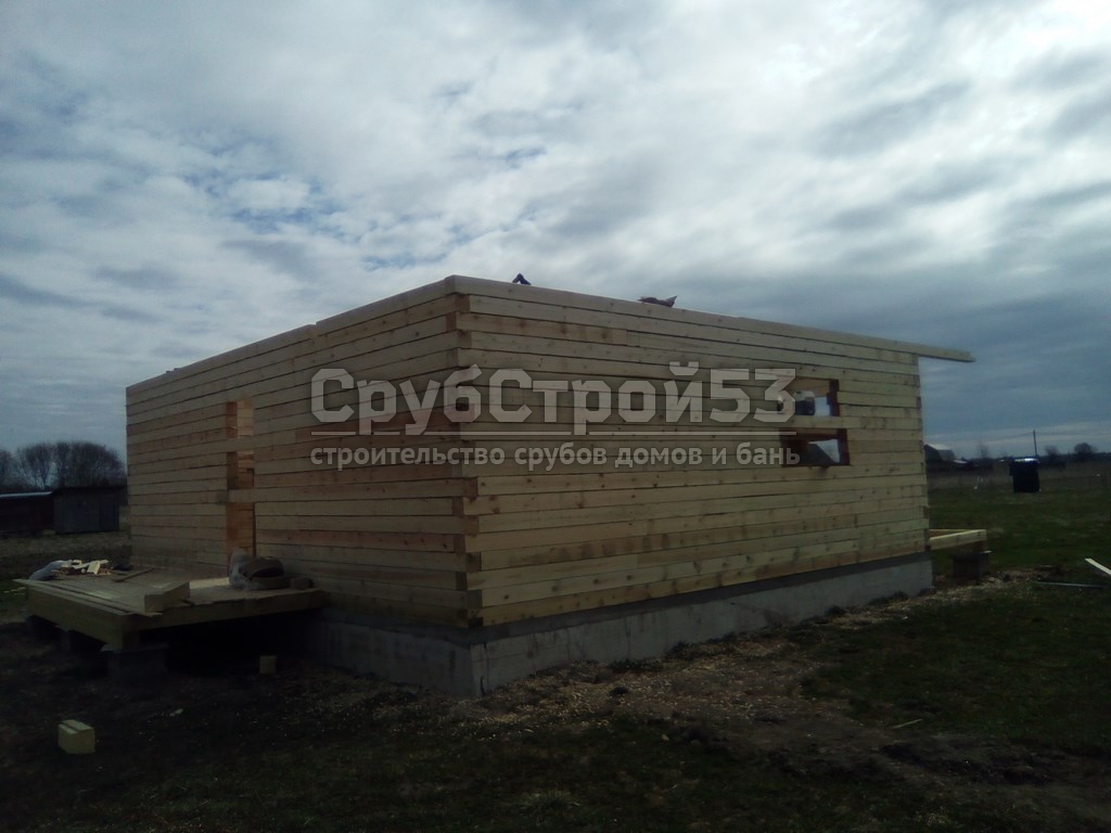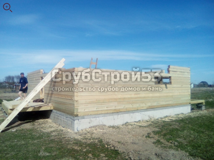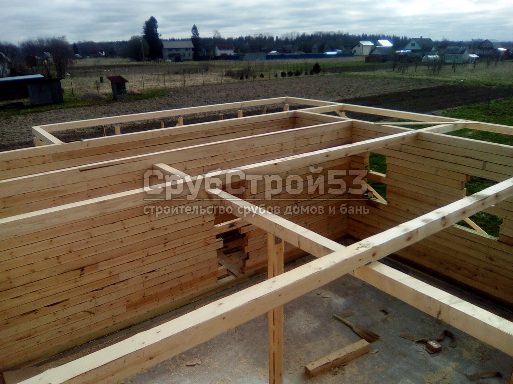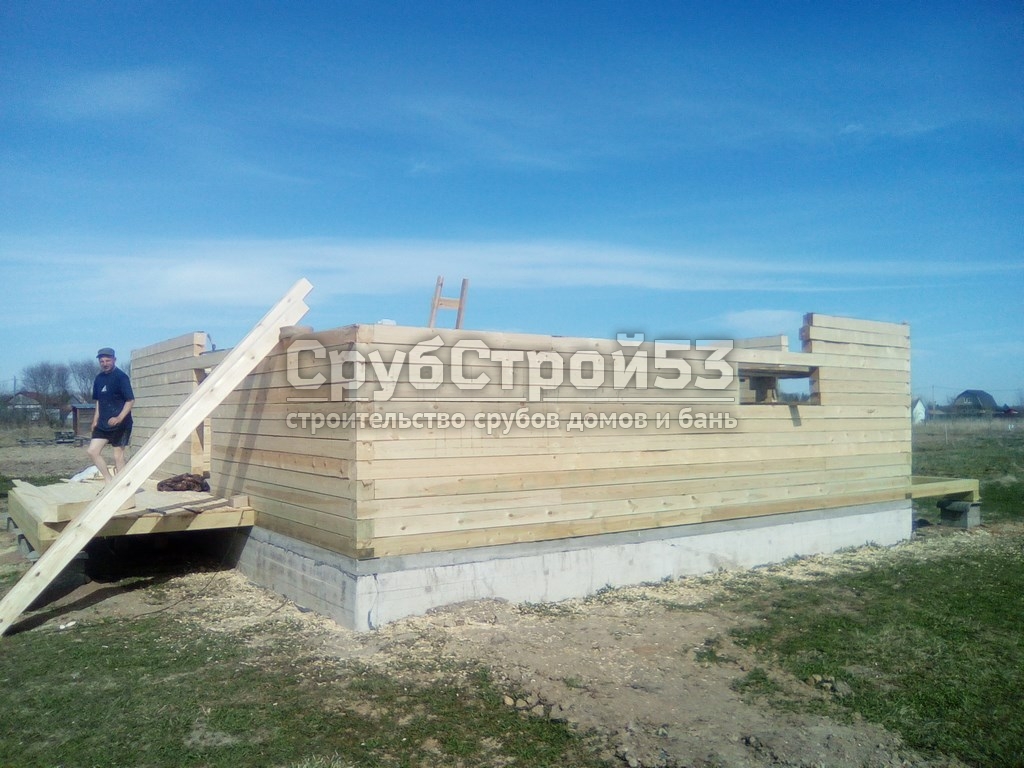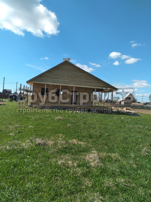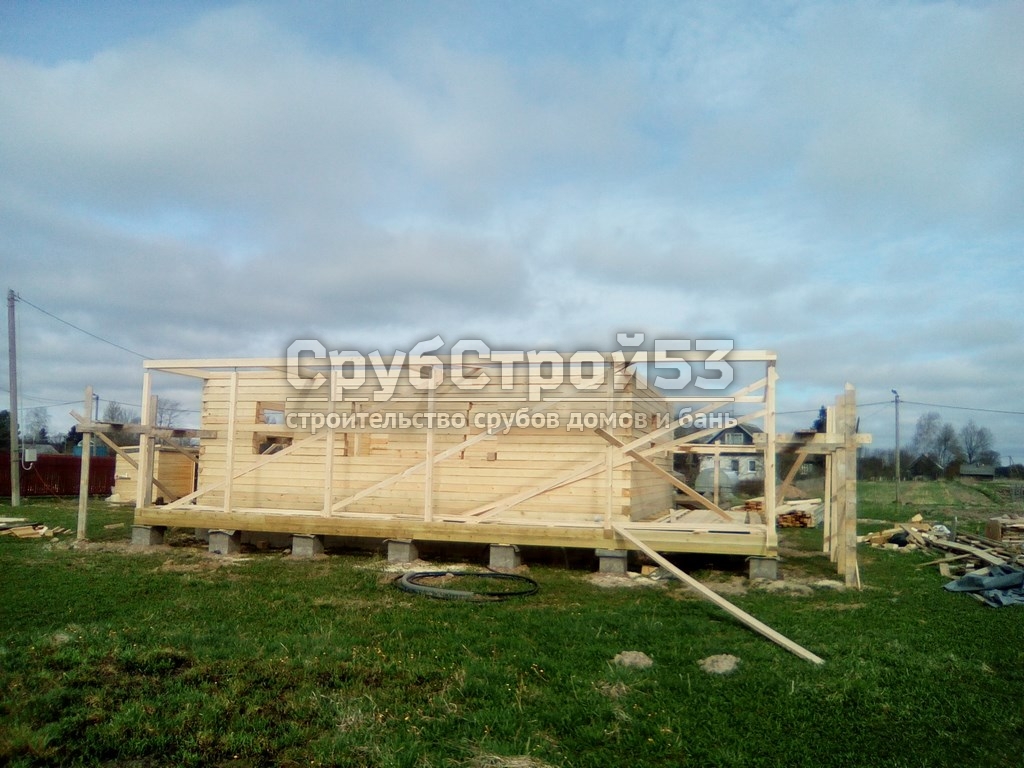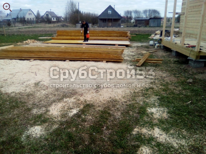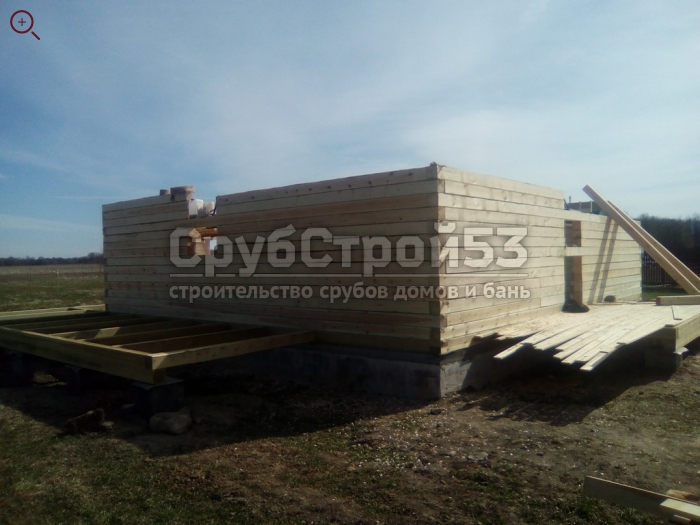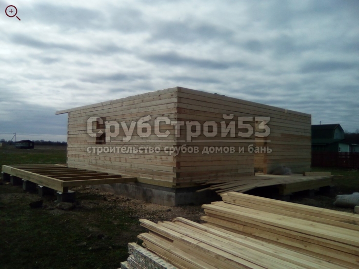 Одноэтажный сруб дома 8,0х9,0 из обрезного бруса 150х150 и терраса буквой Г 1,5х11,5 и 2,5х7,5 под общей двухскатной крышей и крыльцо 2,0х4,0 под отдельной крышей построен в Ленинградской обл., Волосовский р-н, п. Калитино.