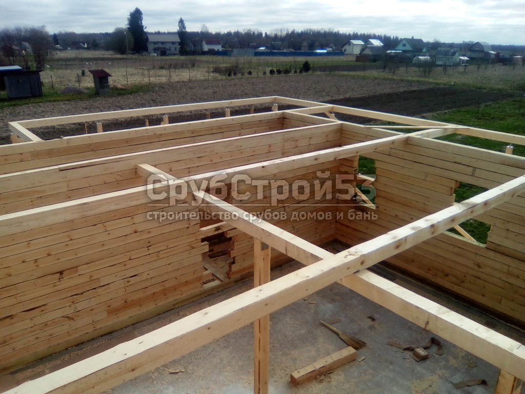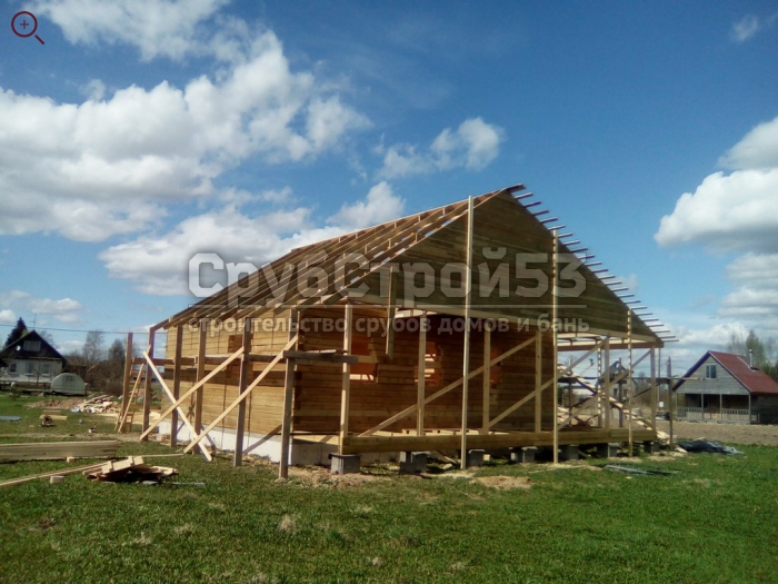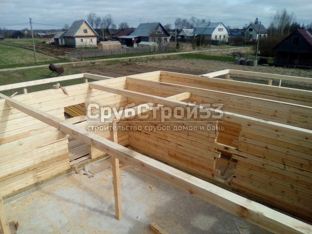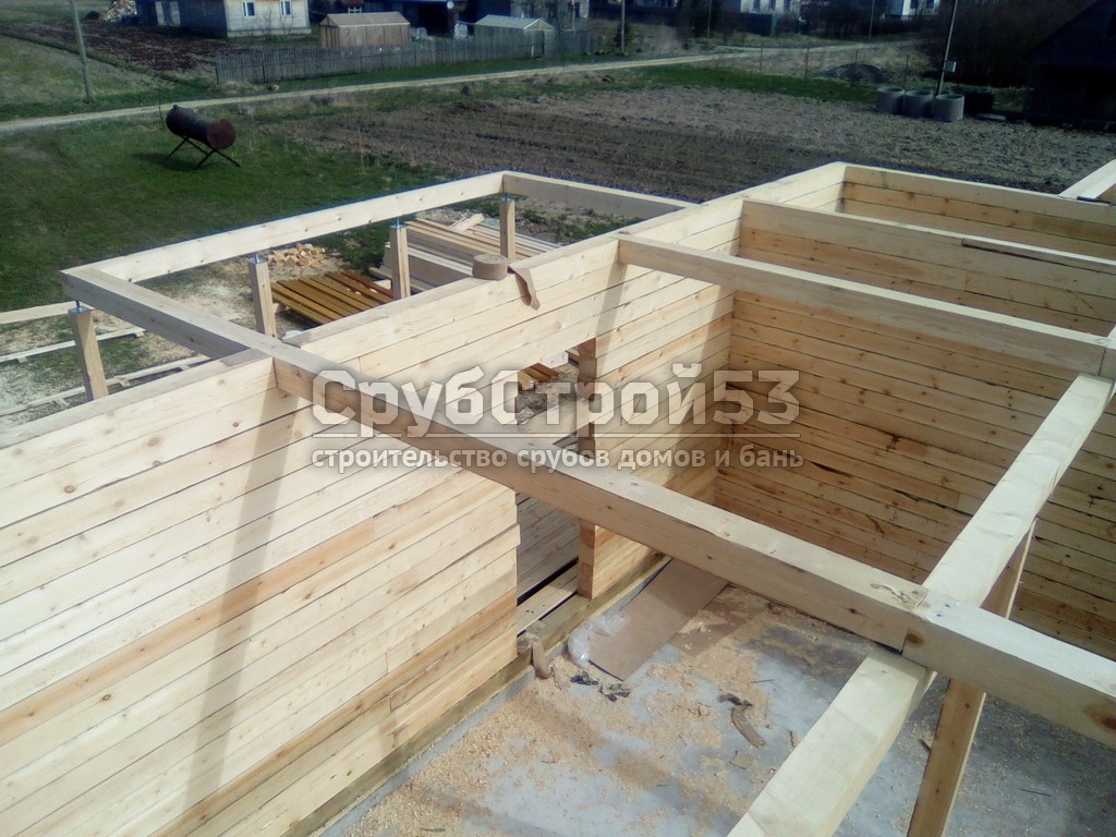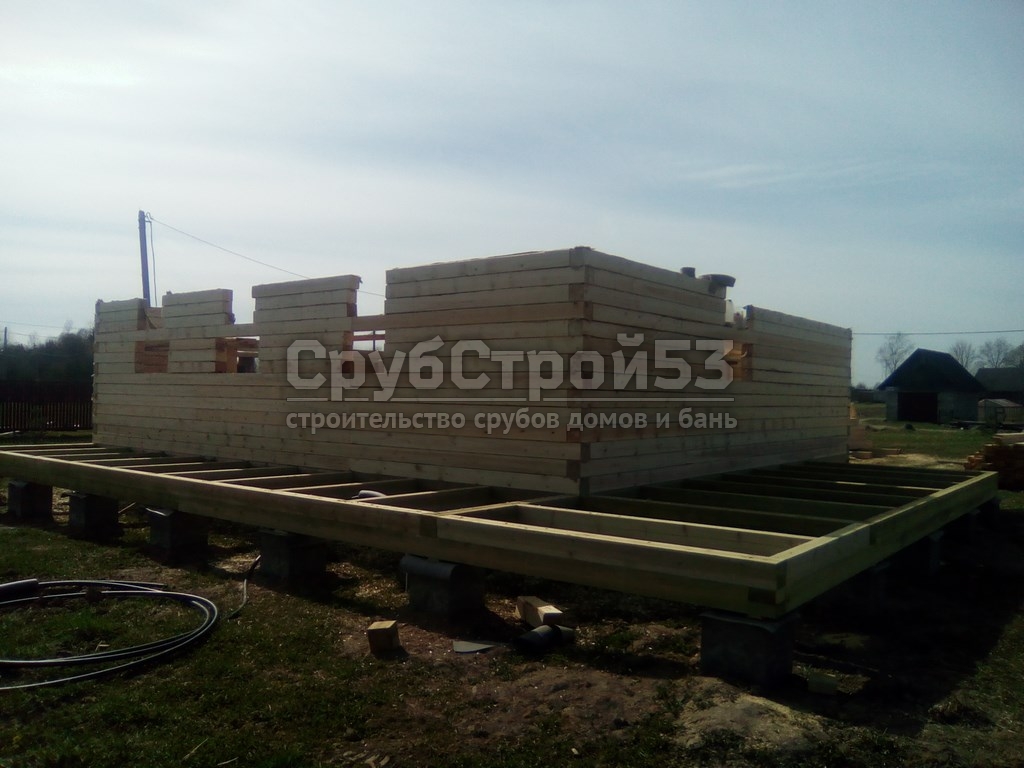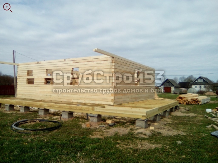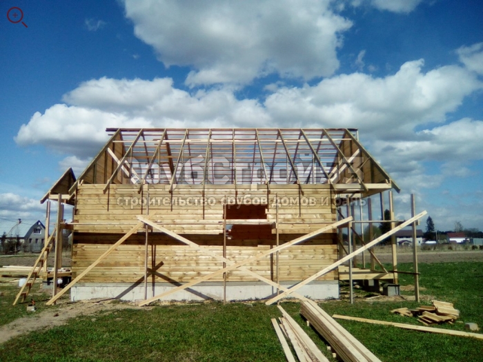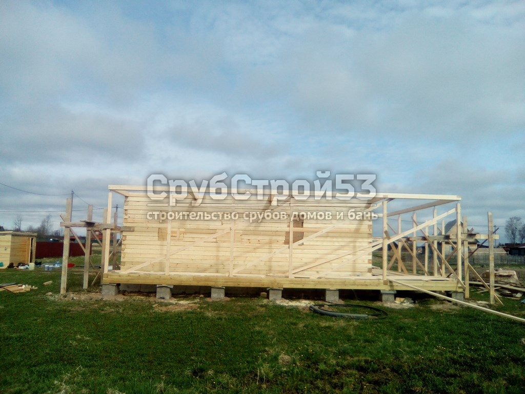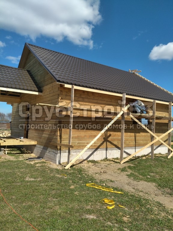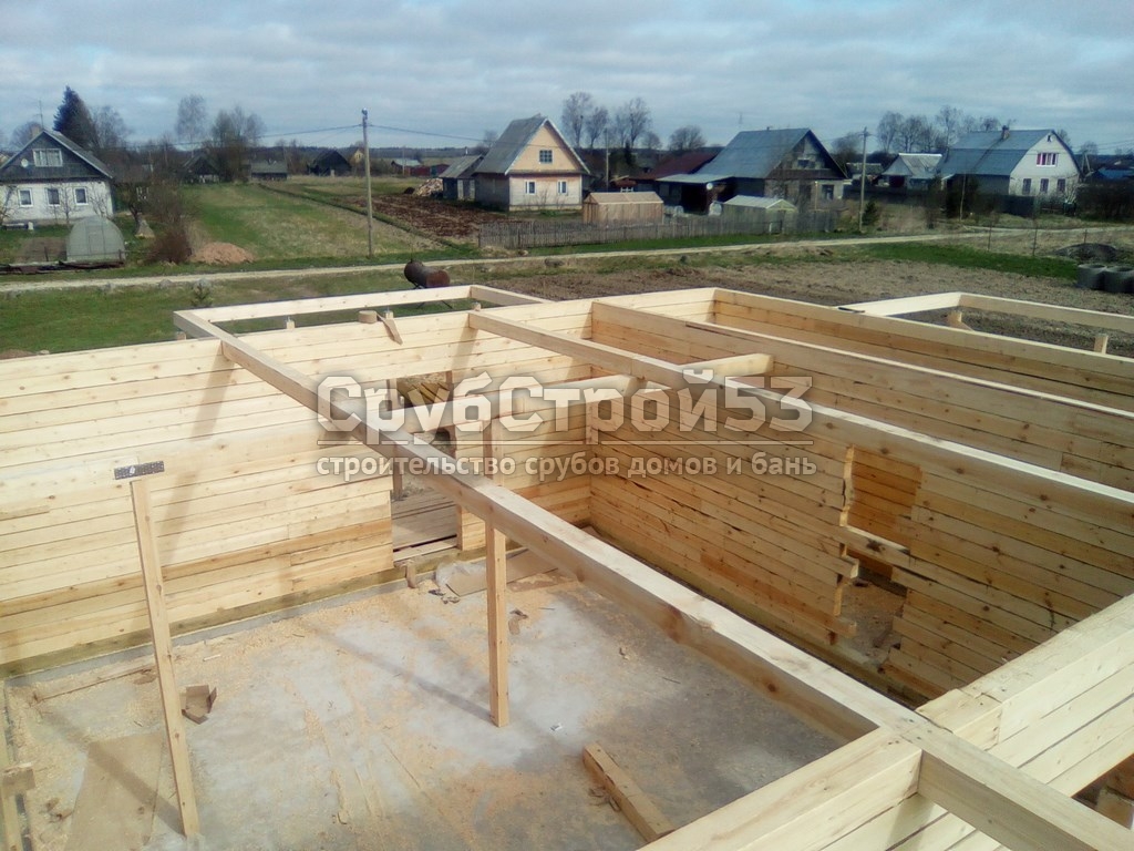 Одноэтажный сруб дома 8,0х9,0 из обрезного бруса 150х150 и терраса буквой Г 1,5х11,5 и 2,5х7,5 под общей двухскатной крышей и крыльцо 2,0х4,0 под отдельной крышей построен в Ленинградской обл., Волосовский р-н, п. Калитино.