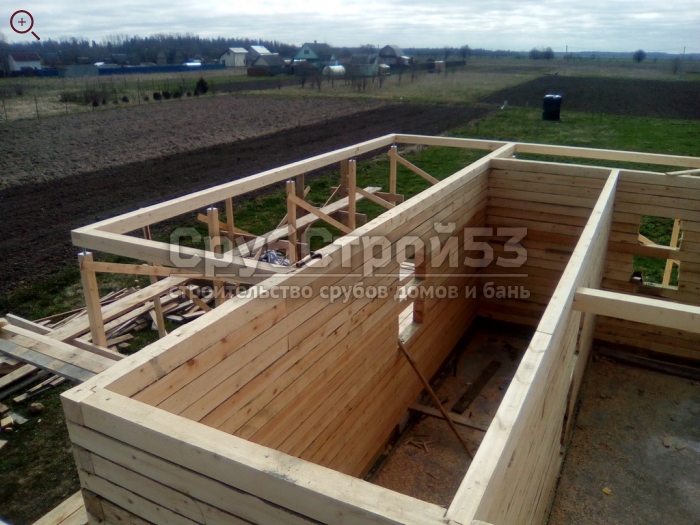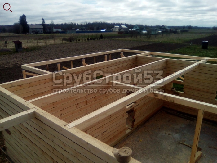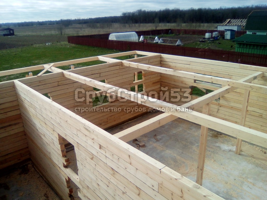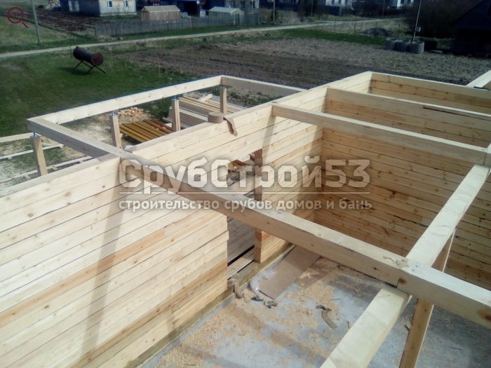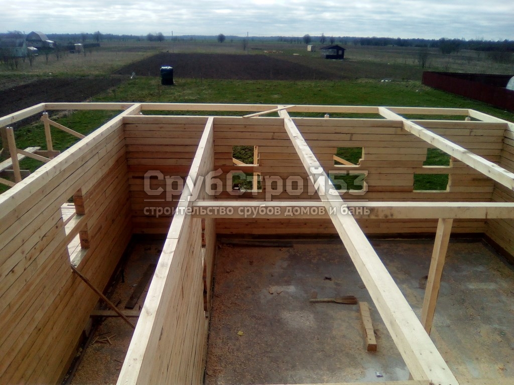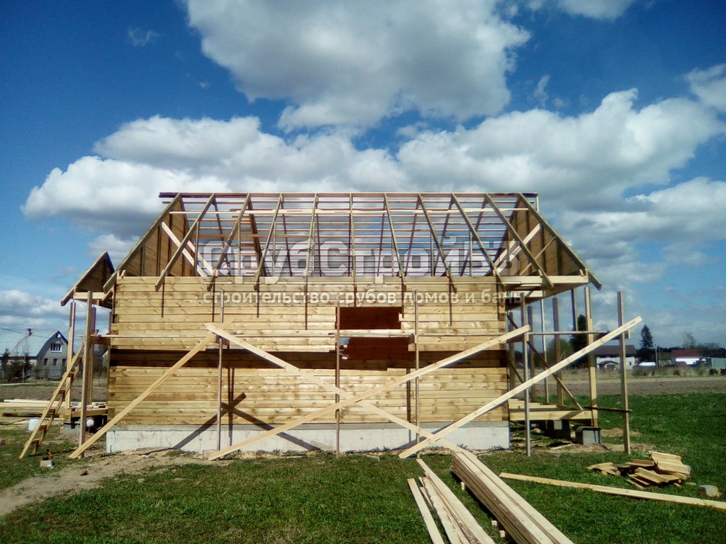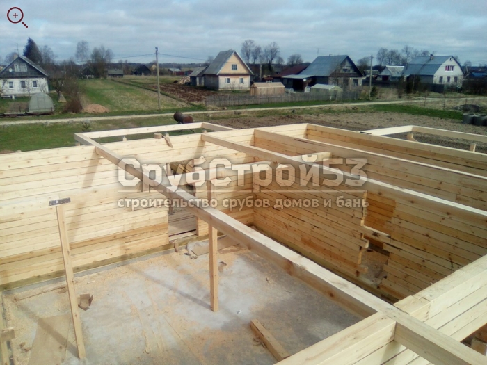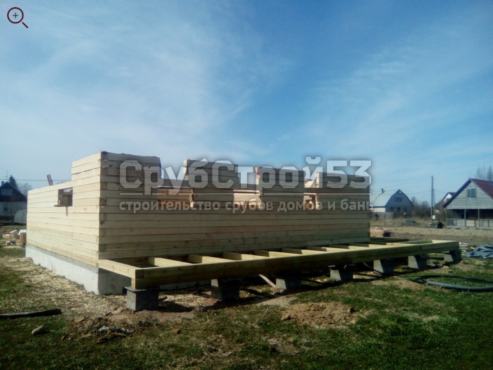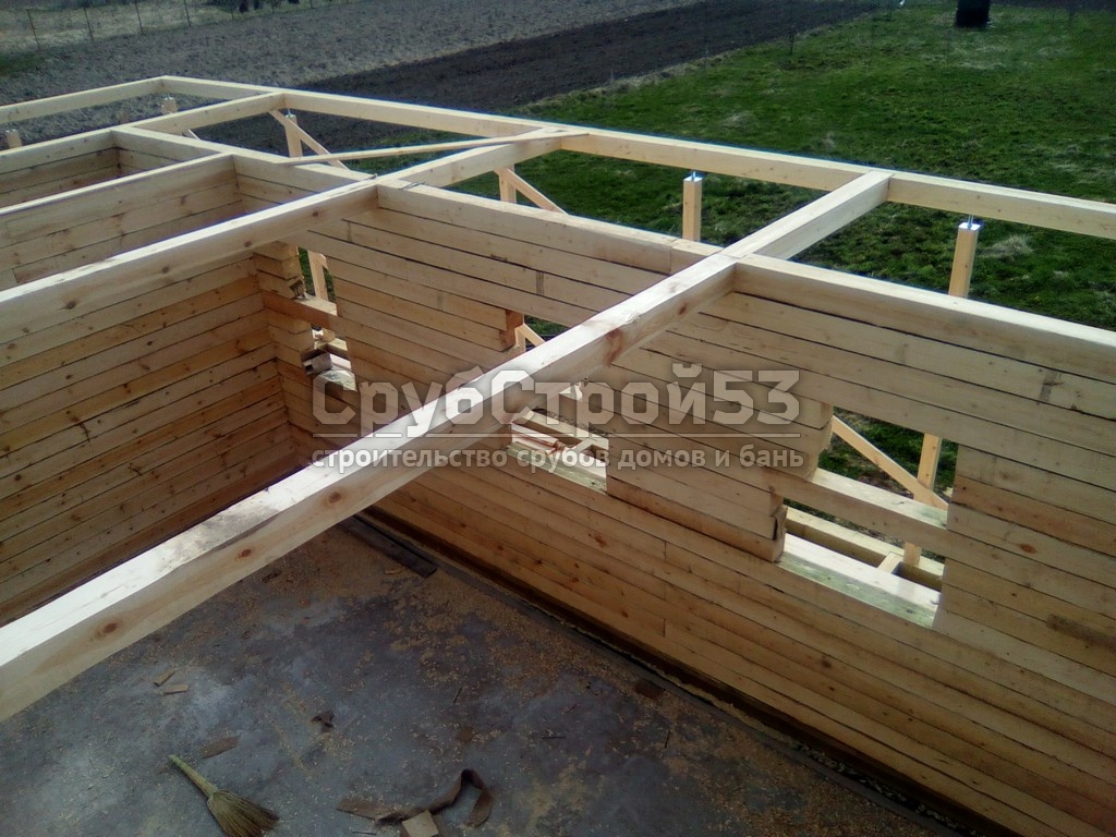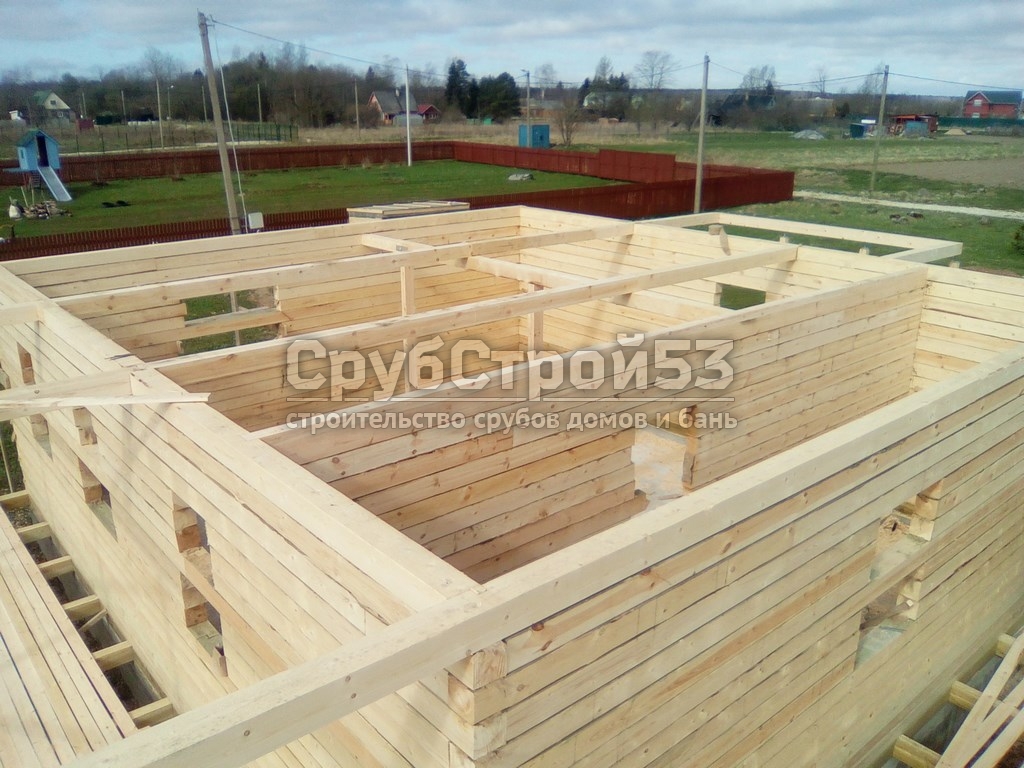 Одноэтажный сруб дома 8,0х9,0 из обрезного бруса 150х150 и терраса буквой Г 1,5х11,5 и 2,5х7,5 под общей двухскатной крышей и крыльцо 2,0х4,0 под отдельной крышей построен в Ленинградской обл., Волосовский р-н, п. Калитино.
