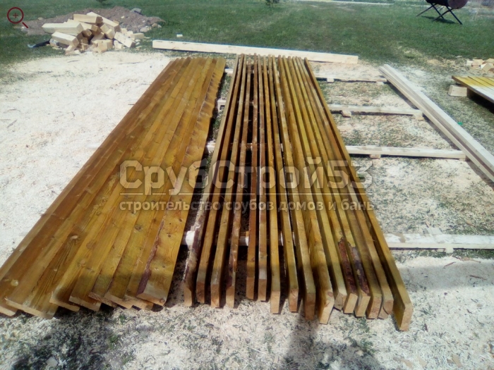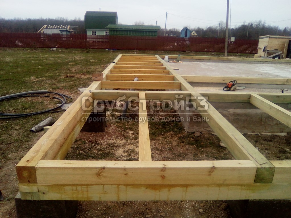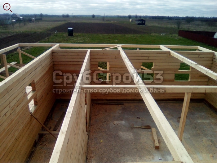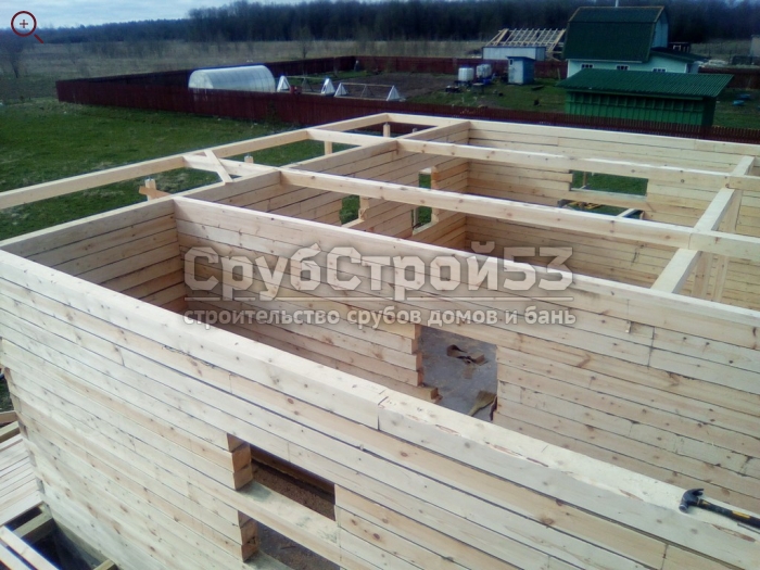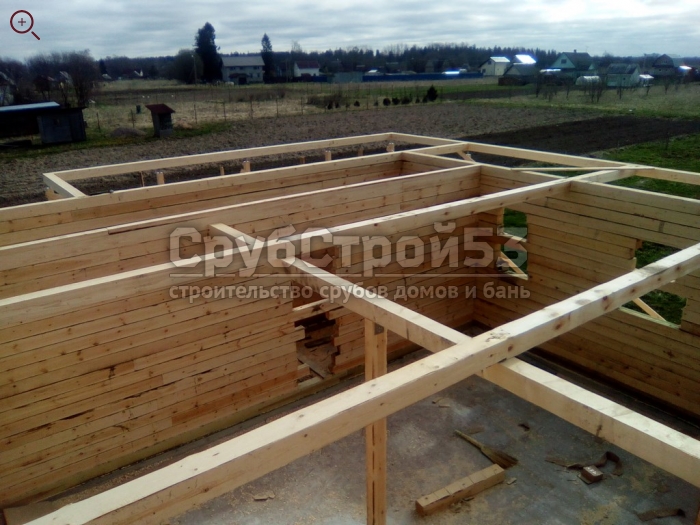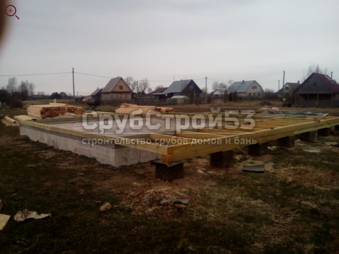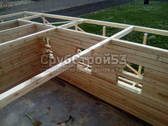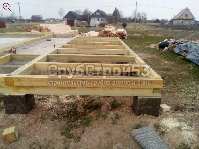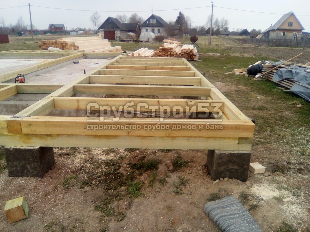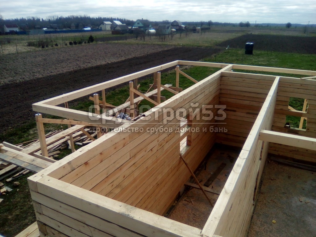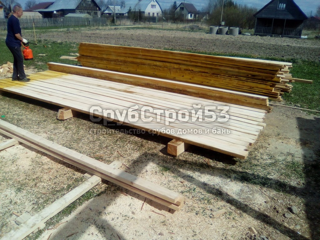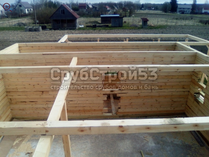 Одноэтажный сруб дома 8,0х9,0 из обрезного бруса 150х150 и терраса буквой Г 1,5х11,5 и 2,5х7,5 под общей двухскатной крышей и крыльцо 2,0х4,0 под отдельной крышей построен в Ленинградской обл., Волосовский р-н, п. Калитино.